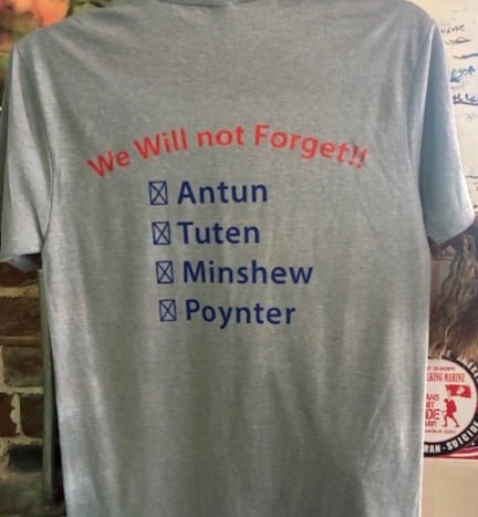 The “We will not forget” shirt pictured at right, can currently be purchased at Pajamadave’s Beer & Wine Garden, 12 South 2nd Street downtown for $20.